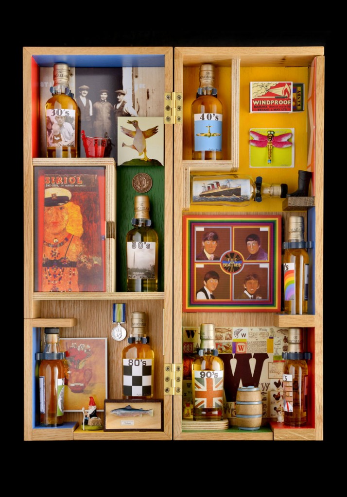 The Macallan and Sir Peter Blake celebrate eight decades consists of an oak box, divided in to eight sections, each decade having a backdrop and artefact designed, inspired or chosen by Sir Peter Blake, a miniature of The Macallan distilled in that decade (1930 through to 2000’s), with labels designed by Sir Peter and a small book of illustrations and text about Blake’s life.