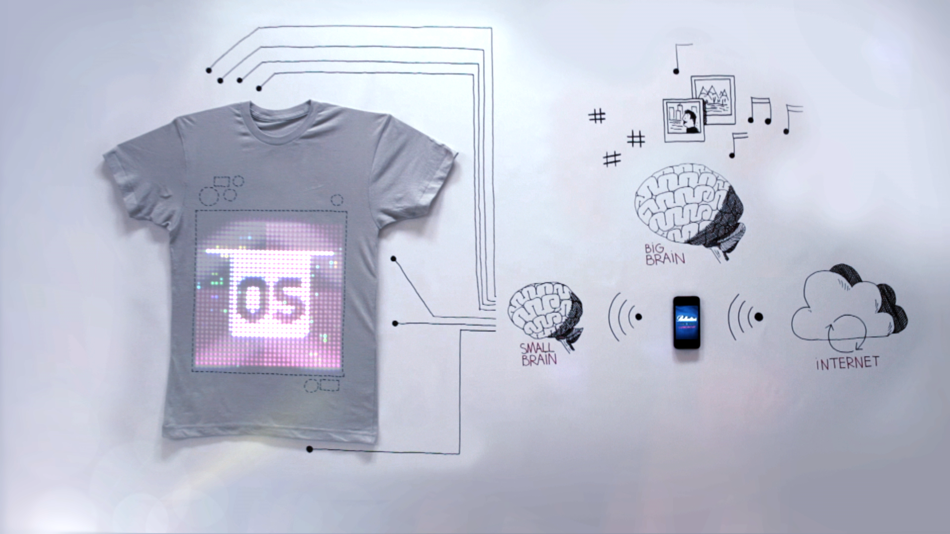 Introducing tshirtOS. Wearable, shareable, programmable and 100% cotton, tshirtOS allows you to share your Facebook Status, Tweets, photos and favourite songs with anyone who walks your way. A built-in camera allows the wearer to take photos and a headphone jack to listen to music directly from iTunes.