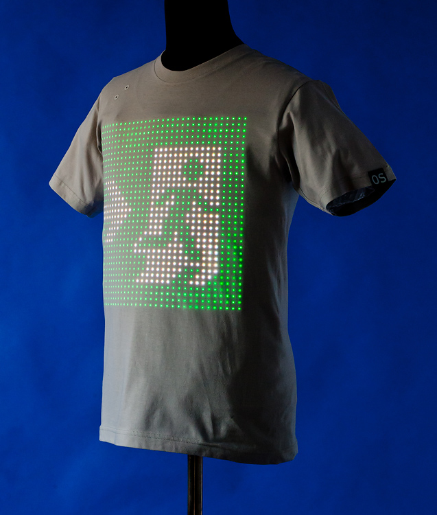The LED Screen has a resolution of 1024 pixels, spaced 1cm apart, in a 32 by 32 pixel grid embedded into the fabric of the t-shirt. Each pixel is RGB (Red Green Blue) to make a full colour display. The LEDs used are ultra thin (like a sheet of paper), the brightest full colour discreet LEDs in the world at this thinness and only 2 by 2 mm wide. The screen is controlled by 32 ultra thin microprocessors, managing the screen control software “Q” by CuteCircuit.