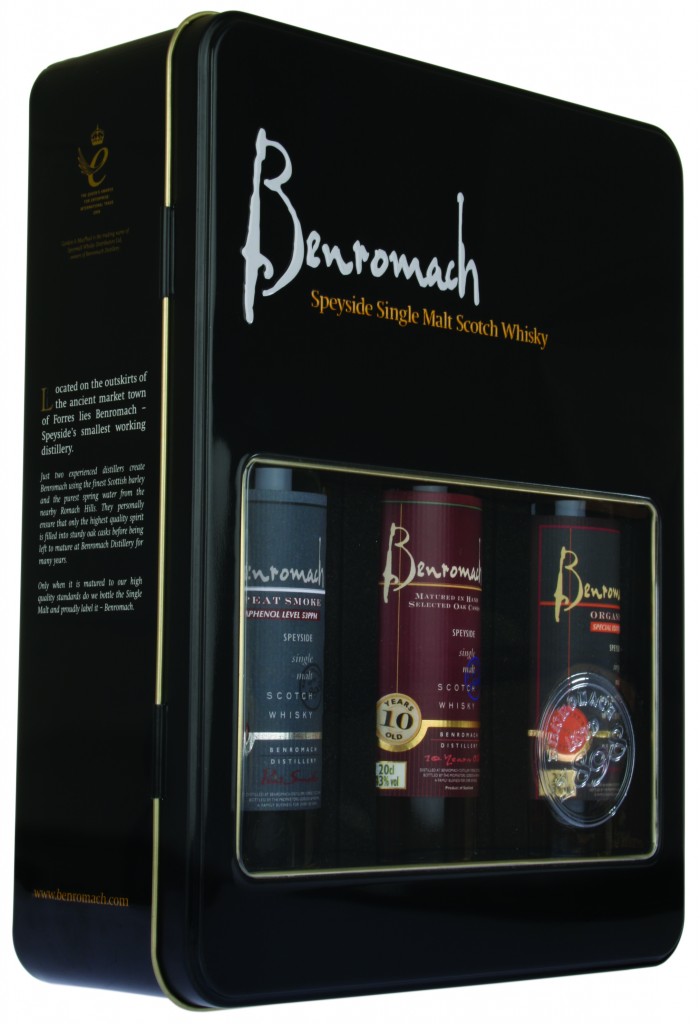 The gift pack, with contemporary tin plate packaging and Benromach’s sophisticated branding, contains three 20cl bottles of the distillery’s flagship single malt, Benromach 10 years Old, along with the Benromach Peat Smoke and the Benromach Organic, which was the first certified organic single malt Scotch whisky.