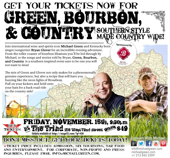 Join international wine and spirits icon Michael Green and Kentucky born singer/ songwriter Bryan Glover for an incredible evening adventure. From the roller coaster of bourbon libations you’ll be led through by Michael, to the songs and stories told by Bryan, Green, Bourbon, and Country is a southern inspired event sure to be one you will not want to miss! The mix of Green and Glover not only makes for a phenomenally genuine experience, but also a recipe that will have you buzzing like the neon lights of Broadway. Pull on your kickers and hold onto your hats for a back road ride on the country side!