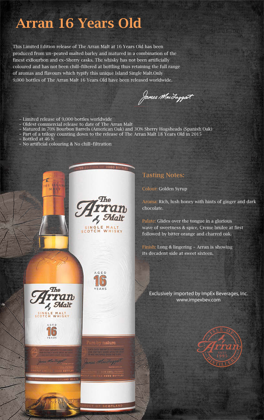 2. Jura Mountain of Gold 15 Year – 46% – Pinot Noir Cask Finish – 1366 Bottles – My Tasting Note: “Nose: honey and nuts with spice, new leather sofa and fresh hewed wood; assorted jujubes, candied orange, date squares and Demerara sugar; Palate: big, leathery, fruity and sweet with some tingling spicy; orange coated almonds, beer nuts, candied ginger and orange with cinnamon and anise; chewy with jujube like fruit notes, leather and firm tannins; Finish: mid length, coating and leathery with fading sweet and spice.*