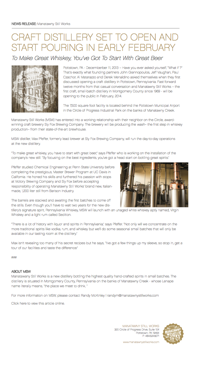 Manatawny Still Works “Craft Distilled Spirits” – American Whiskey News