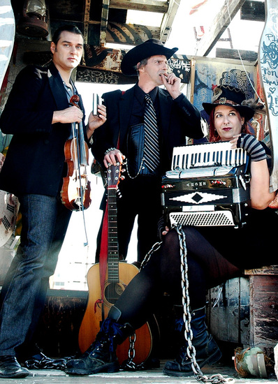 Paul; aye sounds strange – but interesting, do continue;  Emchy; we are two veterans of the SF Bay Area punk rock scene. With myself on accordion and vocals, and Boylamayka on acoustic guitar, we began writing songs with a variety of musical and influences, from German cabaret to blues and folk and beyond. In 2010 the band was joined by Sizzle le Fey on fiddle (Paul; hold it there, made up name surely?). We quickly developed a reputation as hard drinkers infusing traditional music with the energy of their punk roots.