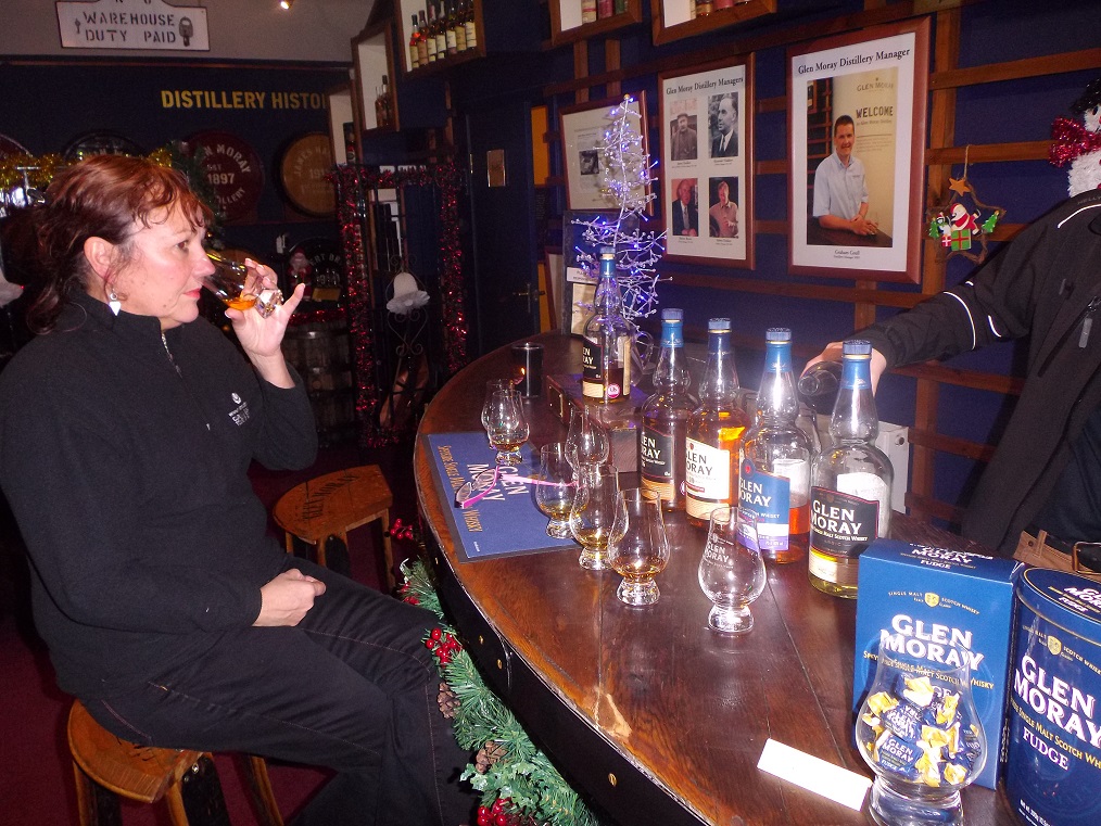 The annual outing this year (2014) saw them driving up to Elgin, leaving Broughty Ferry at 07.45 on Thursday, via Aberdeen, Huntly and Keith, to arrive at Elgin approx. 11.30. Some local shopping (Liz) and lunch before dropping into Glen Moray distillery – as previously planned. Says Paul; A quick nose around the shop (for later), a cup of tea, then a wee chat with Iain, our friend and whisky man at GM. It was Iain who would take us both on a half day whisky school – I have to say, this was originally for the benefit of Liz, but I too learned a lot! Discovering all areas of the distillery, in depth knowledge flooded out of Iain, didnee know you were also a chemist Iain! It was a really grand time we had, both of us learning new things and some we hadnee come across before, superb! This was followed by a tasting, Iain did us proud here – as you can see by the photos, specially the one of Liz very content with a dram! There then followed what can only be called “a Liz shopping frenzy!” A nice bottle and glasses in a box (4 of these), a Chardonnay finish and two direct from the cask sherry finish, some wee goodies, all coming to a couple of hundred pounds lighter in the wallet! Paul’s wallet!!! “I’ll pay you back at home” says Liz, aye right, along with that other 14 grand you owe me!