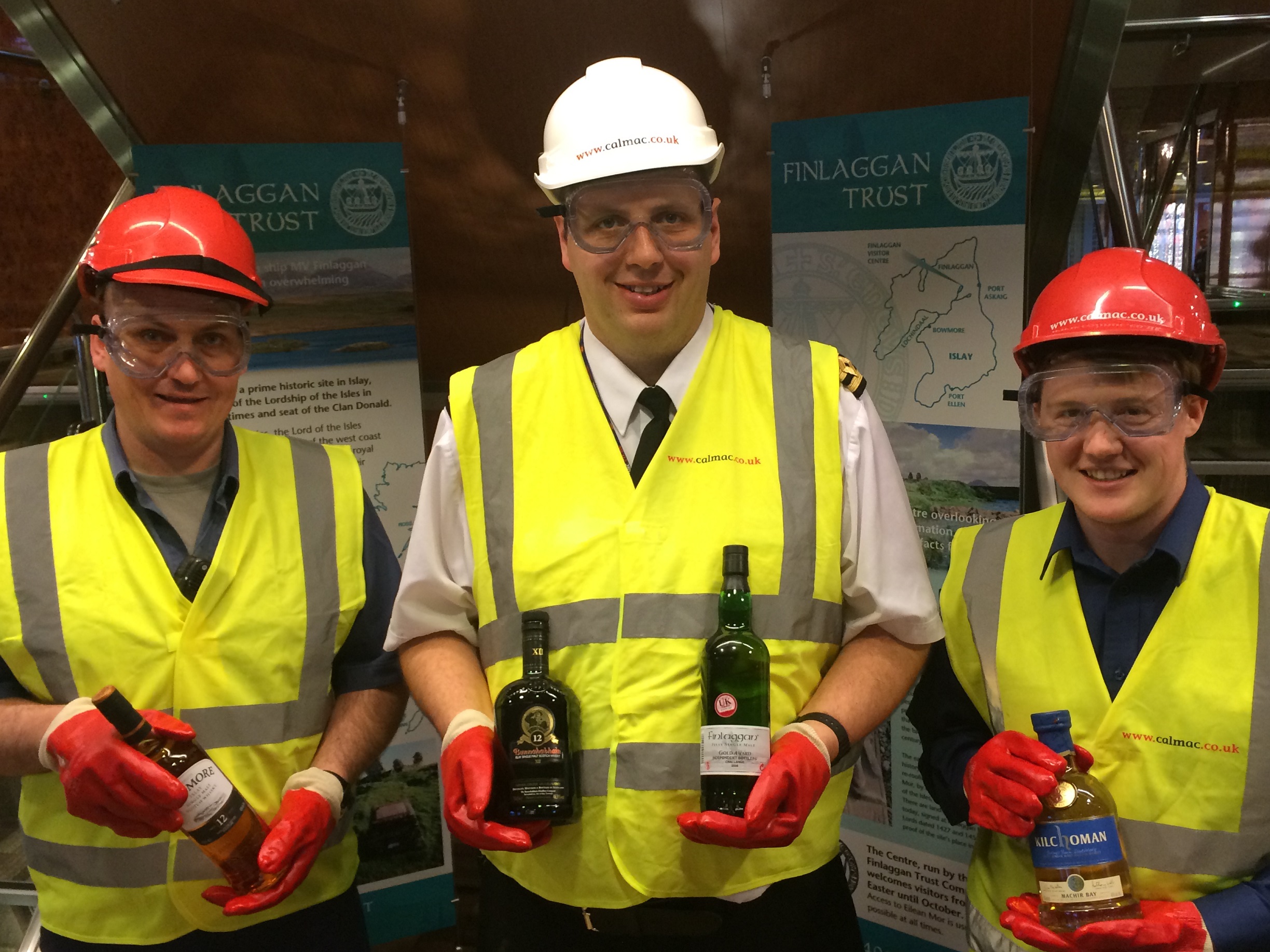Handling with care – crew members (left to right) deck trainee Jamie Knox, chief officer and safety officer Lee McDowell and quartermaster Malcolm Miller from MV Finlaggan with just a little of Islay’s precious malt whisky cargo; just one of the reasons the ship has picked up an International Safety Award with merit
