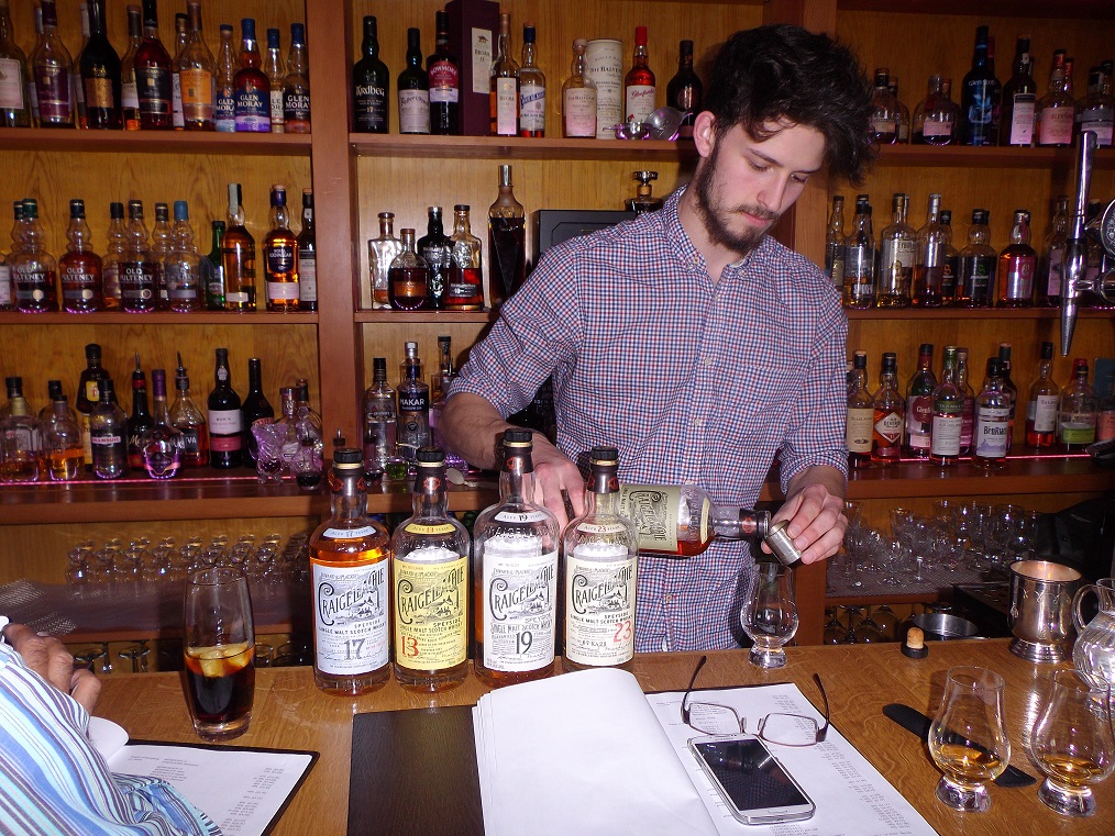 The nose was slow to waken but led to comments like ‘Warm, rich, teasing’ and ‘high quality’ – toffee, chocolate éclairs, fudge and golden syrup promenaded alongside flower meadows and fresh hay – but slate, coal-tar, leather, brass and pine spoke of old-fashioned iron-mongers. The unreduced palate was pleasantly mouth-flooding with big flavours of sherry, roasted chestnuts, leather, dried fruits and heather stems after moor-burning. The second nosing had candles, fortified wine and saddles (d’Artagnan arrives at the inn?). Water helped the palate to consolidate and come together in harmony – brown sugar, dark chocolate orange creams, rum-soaked cherries, sweet liquorice and dark honey.