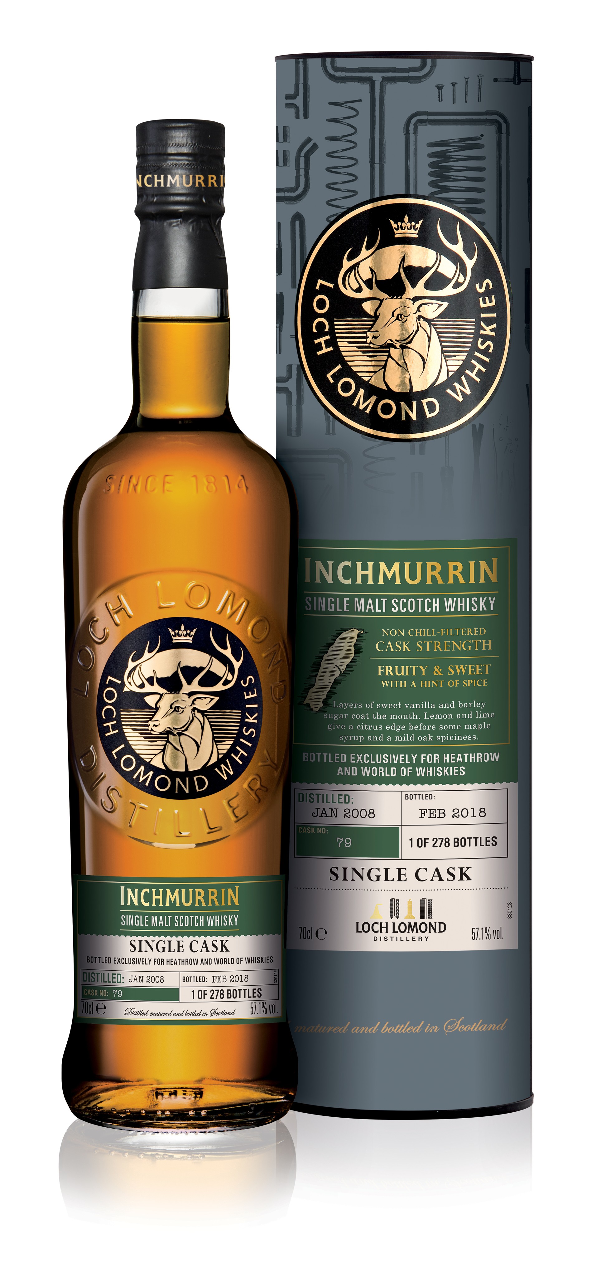 This non-chill filtered Single Malt Scotch Whisky was distilled in the Loch Lomond Distillery’s unique straight neck pot stills in January 2008 and bottled at cask strength – 57.1% ABV – in February 2018.