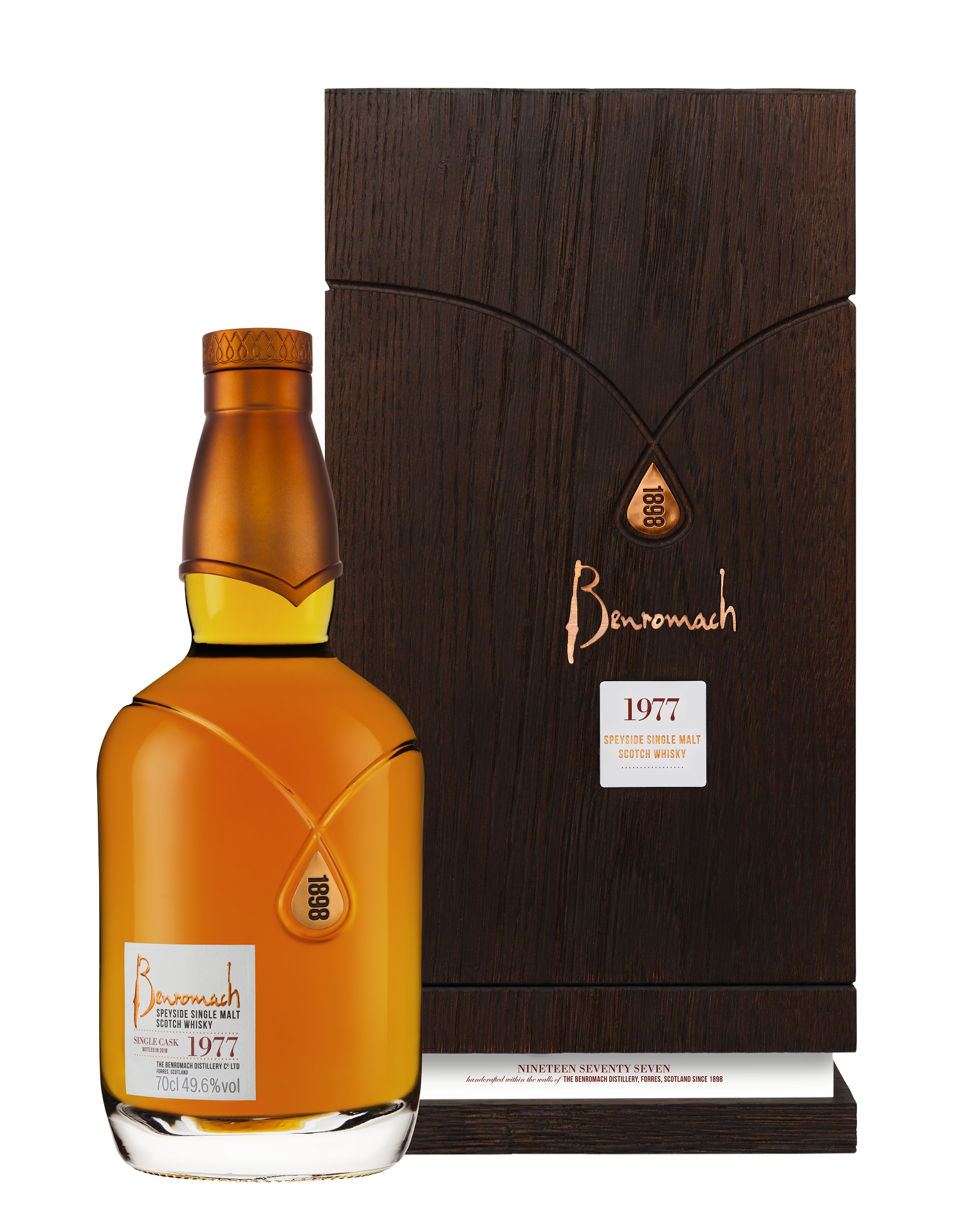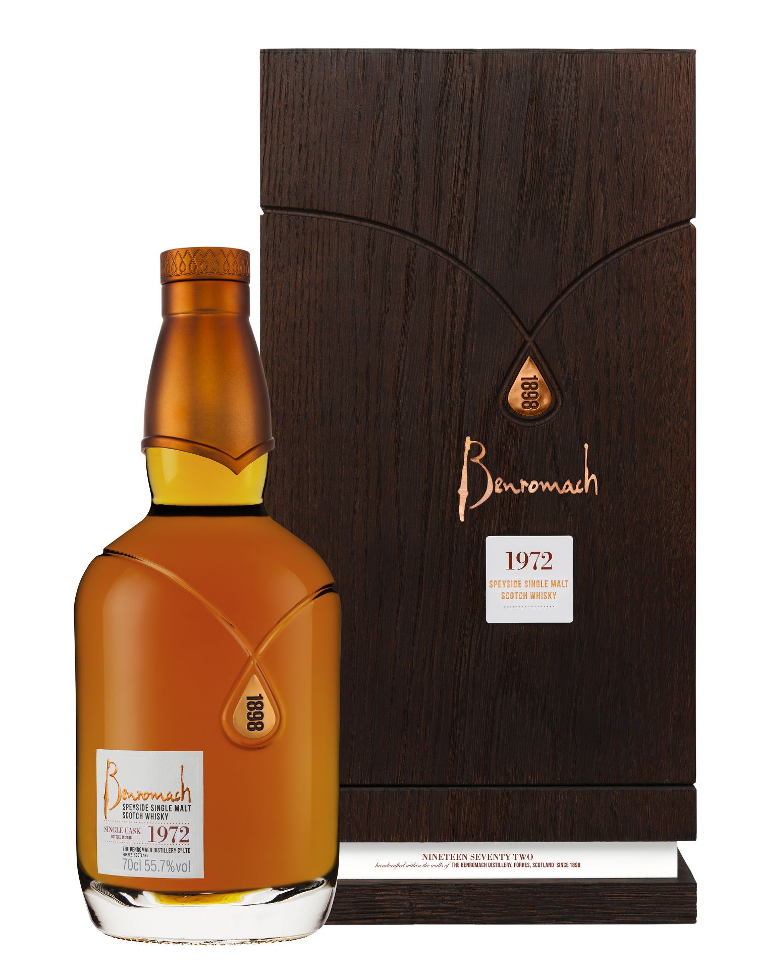 Both expressions are beautifully presented in a decanter-style bottle with shapes and textures inspired by the distillery. The bottle has a copper-foil embossed label and nestles in a dark oak wooden box, representing the original washbacks at Benromach. The copper cut medallion on the packaging signifies the moment in time when the distillers cut to the sweet heart of the spirit run.