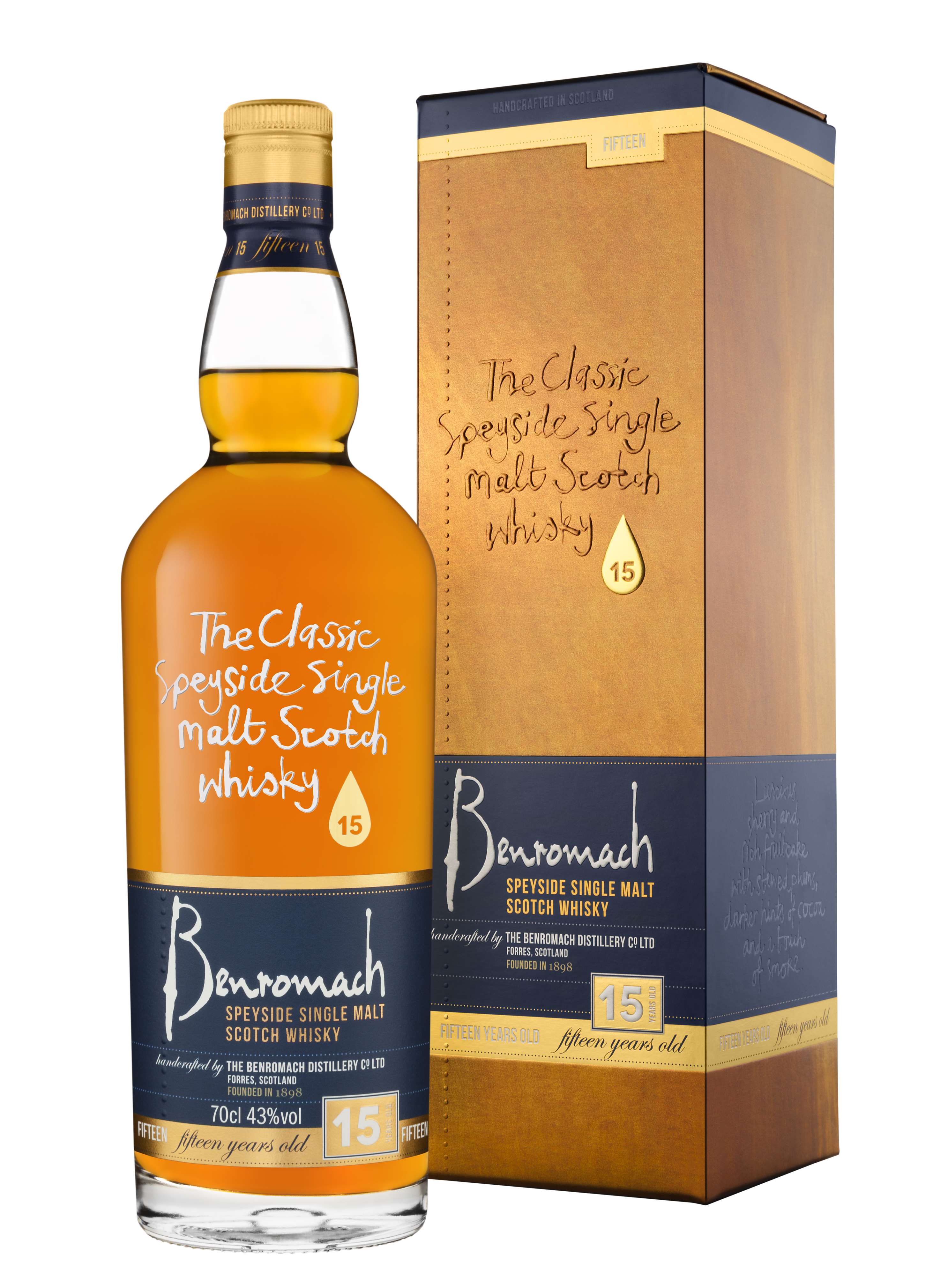“Like all our whiskies, Benromach 15 Years Old is handcrafted using the finest natural ingredients and is a distinctive Speyside whisky with a subtle smoky character. The longer maturation softens its smokiness to hints of charred smoke while developing the wood imbued character of succulent honey, vanilla and fruit.”