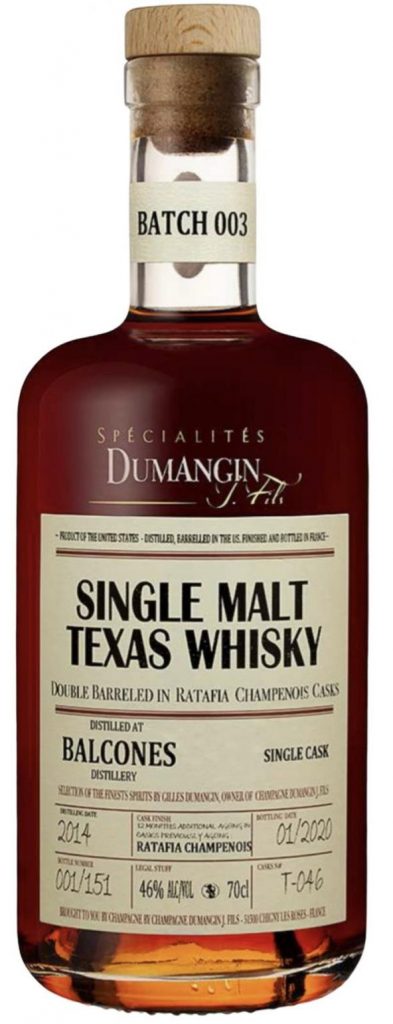 - Dumangin Balcones 2014 Texas Whisky – 46% – Finished 12 Months in Ratafia Champenois – My Tasting Note: “Nose: oily and spicy with dark fruits; if I hadn’t known this was a single malt I’d have suspected rye from my first impressions: rye bread and big dill notes; quince paste and grape extract; singed orange peel and brown sugar… Old Fashioned territory; dried hay bales and freshly coopered oak. Palate: there those intense spicy notes again… more rye bread, more dill, and so oily… I would totally have guessed this was rye blind; the spirit is complex, layered and very enticing; there is a smokiness I can’t quite put my finger on, Cuban cigar tobacco and salted Dutch licorice; Demerara sugar and more orange notes, both candied peels and orange bitters. Finish: long, drying and spicy; still in the rye notes wheelhouse with the softness of a malt spirit. Comment: love it… this is like a finely crafted cocktail in a whisky; nice balance, lots of layers; youthful but complex.” – $195