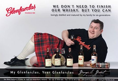 Continuing in this vein I wanted the third bottling to be even more whimsical or if you prefer, ridiculous, than the first two. It takes its inspiration from an advertisement for Glenfarclas circa 10 years ago featuring a reclining George Grant in kilt with a selection of whisky in front of him. This has long been one of my favourite images of anything to do with whisky. So…