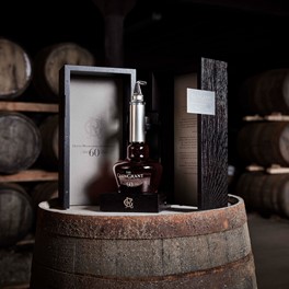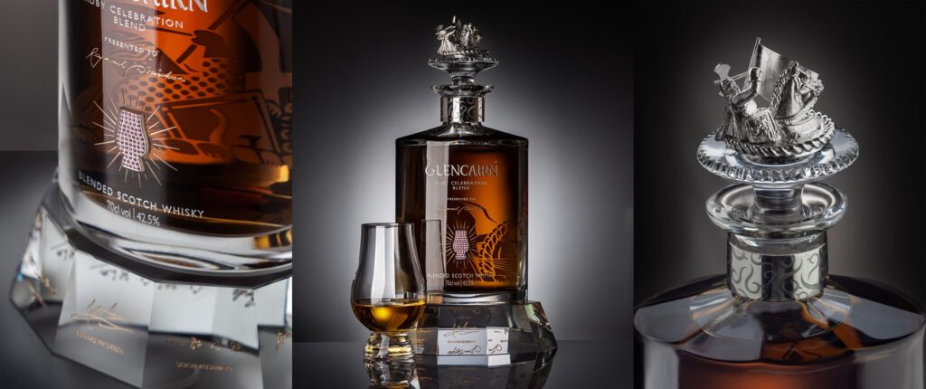 We created each of the 360 decanters from hand-blown crystal glass and the shape was inspired by Glen Grant’s tall, slender pot stills. Each one is beautifully engraved and infilled with a champagne gold finish.