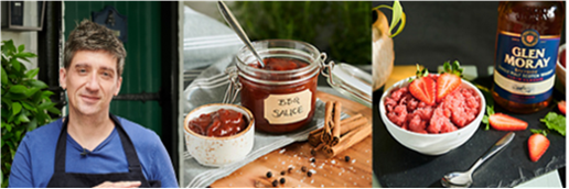Ben has created a rich, tangy ‘Ultimate BBQ Sauce’ with a tasty whisky kick that’s easy to make and perfect for marinading steaks, basting on meats and veggies or slathering on a burger before topping with cheese. He also turns seasonal, summery strawberries into a refreshing and vibrant Strawberry Daiquiri Granita ‘iced cocktail’ dessert with a lovely Glen Moray hit.