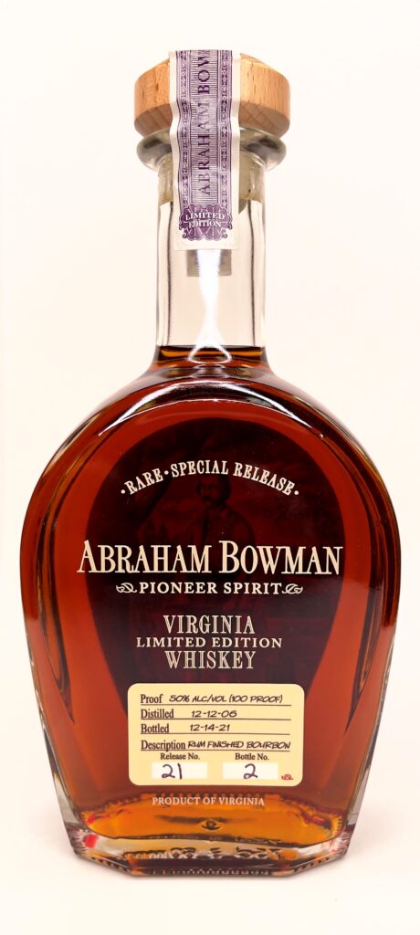 The Abraham Bowman Rum Finished Bourbon is part of a series of limited-edition whiskies, named after Abraham Bowman, the commander of the 8th Virginia Regiment in the American Revolutionary War. Each edition of the Abraham line is a different expression and a new release is offered a few times a year.
