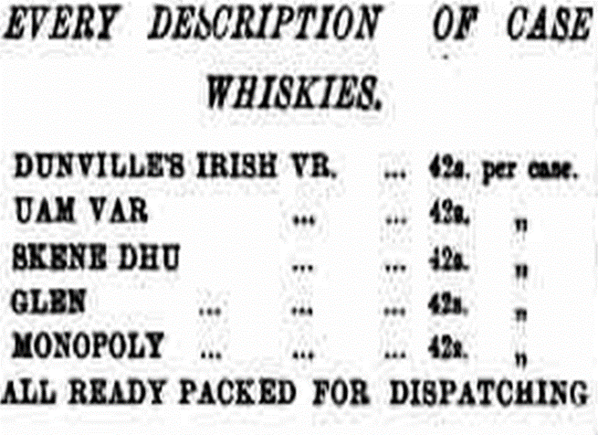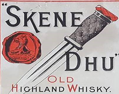 Certain whiskies were even available by the case for just 42 Shillings (£2.10 in today’s money). As can be seen from the extract from the advert below, these whiskies included one called “Skene Dhu”. This brand name was a reference to the small twin-edged Scottish dagger historically carried in a Scotsman’s hose or long boot. However, the “Skene Dhu” spelling used is unique, being different from the more now more common ‘sgian-dubh’ or ‘skean dhu’.