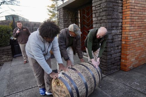 L to R Osiris Johnson, Freddie Johnson and Mark Brown roll 8 mil barrel as Master Distiller Harlen Wheatley looks on