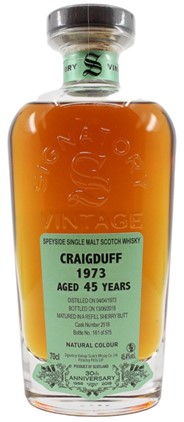2. Signatory 30th Annv Craigduff 1973 – 45.4% – 45 Year Refill Sherry Butt – 91pts Whisky Fun: “Comments: and yet another 30th anniversary bottling by SigV that’s nothing short of impressive. Could we now have a 31st Anniversary series? SGP:651 – 91 points. FULL TASTING NOTE ON OUR SITE” – $2750