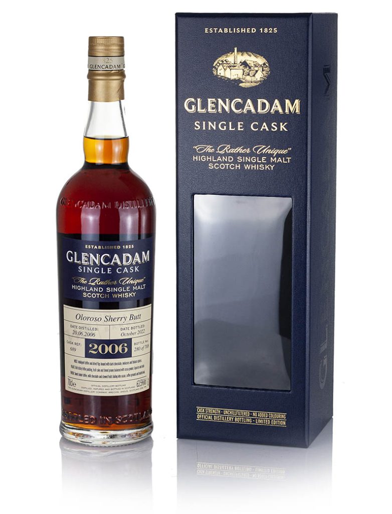 Official distillery bottling single cask Oloroso sherry butt #689. Distilled June 2006 and bottled October 2022 yielding 708 bottles at 63.5% Glencadam 16 Year Old 2006 vintage Highland single malt Scotch whisky. Single cask Oloroso sherry butt #689 distilled June 2006 and bottled October 2022. 708 numbered bottles.