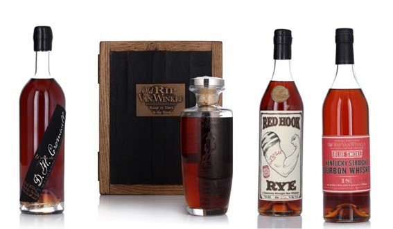 From left to right: D.H. Cromwell 15 Year Black 1999-2000 (est. $15,000 – 20,000); Old Rip Van Winkle 25 Year Old Decanter 50.0 abv (est. $20,000 – 30,000); LeNell’s Red Hook Rye 23 Year Old Barrel #1 67.6 abv (est. $20,000 – 30,000); Old Rip Van Winkle 18 Year Old Blue Smoke 92.6 Proof (est. $20,000 – 30,000)