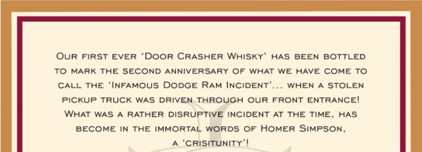 The idea to do a door crasher bottling was born within a couple of months of the break-in, and it was initially hoped we could release one on the first anniversary. That was in retrospect overly optimistic, as the bottling only just arrived in time for the second anniversary.