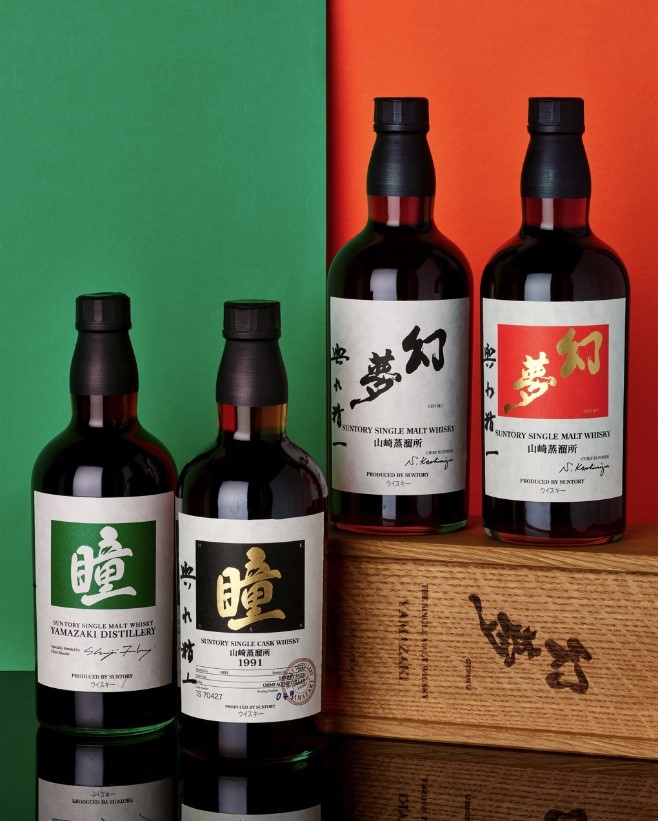Four bottles of Yamazaki-Green Hitomi, Yamazaki-1991-Black Hitomi-Cask #1S70427, Yamazaki-Genmu, Yamazaki-Genmu Premium Red Edition will be auctioned as a set for the first time, carrying an estimate of HK$300,000 – 500,000.