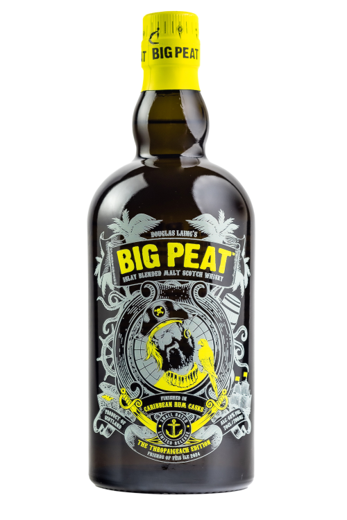 This Limited Edition of Scotch Whisky has a unique, screen-printed design and has been selected as a bottle-only release. The design features Big Peat in pirate-form following the theme centred around the use of Caribbean Rum casks. Big Peat fans can expect a new style of the well-known character featured alongside all things tropical: palm trees, parrots, and swords! A distinctly different colourway leads this release, bringing a bright yellow capsule and design elements throughout.
