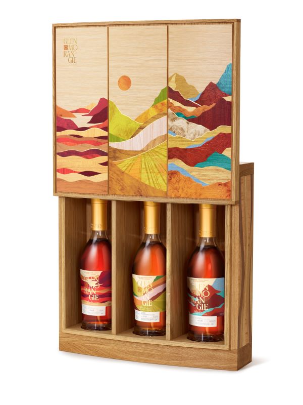 Glenmorangie’s Pursuit of Passion collection is encased in a handmade oak presentation case, designed as an elegant feature piece. Marquetry design work on the back and sides of the box hints at the staves from which wine casks are made, while the front of the case evokes the different landscapes of the three individual wine regions, reflecting the wondrous flavour journey captured in each bottle.