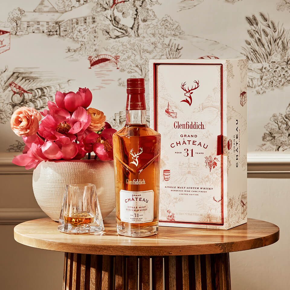 Glenfiddich Grand Château is a 31 Year Old whisky and the first release by the distillery to use Bordeaux red wine casks. The liquid has been matured in American oak before being finished for an extended nine years in Bordeaux red wine casks from the French wine-growing region. The nine year finish adds layer upon layer of new and unexpected flavour. Indulgent and rich, caramelised cherry and apple intertwines with warming spice and toasted oak; an opulent, yet earthy liquid that’s fruity and at the same time floral. This liquid tells the tale of two worlds, drawing inspiration and character from both, to create one exceptional liquid.
