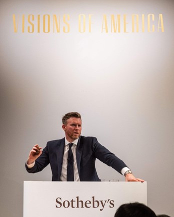 Jonny Fowle, Sotheby’s Global Head of Spirits, on the rostrum during the sale of The Great American Whiskey Collection